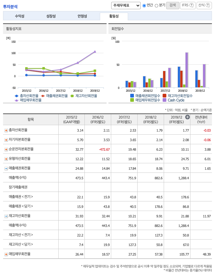 재고자산회전율 : 재고자산은 2017년 127억원, 2018년 50억원, 2019년 67억원으로 감소추세에 있습니다. 재고자산회전율은 2015년 31회에서 2018년도는 9회로 줄었으며, 2019년은 21회로 증가하였습니다.