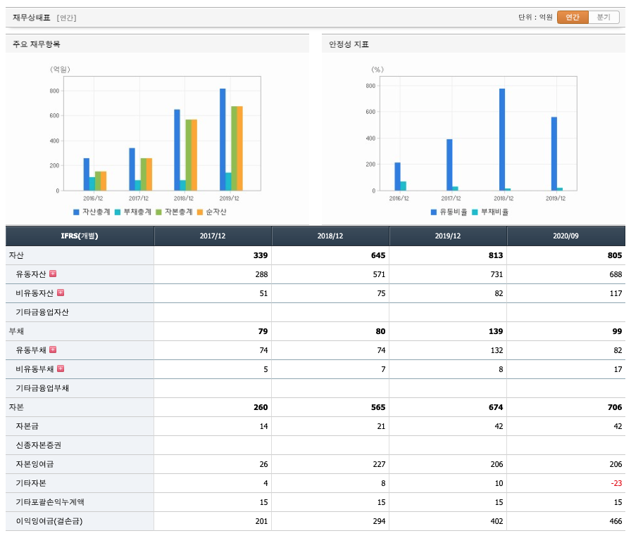자산는 2017년 339억원, 2018년 645억원, 2019년 813억원으로 증가하였으며, 2020년 3분기까지 805억원으로 추정됩니다. 부채는 2017년 79억원, 2018년 80억원, 2019년 139억원으로 증가하였으며, 2020년 3분기까지 99억원으로 추정됩니다. 자본은 2017년 260억원, 2018년 565억원, 2019년 674억원으로 증가하였으며, 2020년 3분기까지 706억원으로 추정됩니다. 자산의 총계는 부채의 비율보다 자본의 비율이 월등히 높습니다.