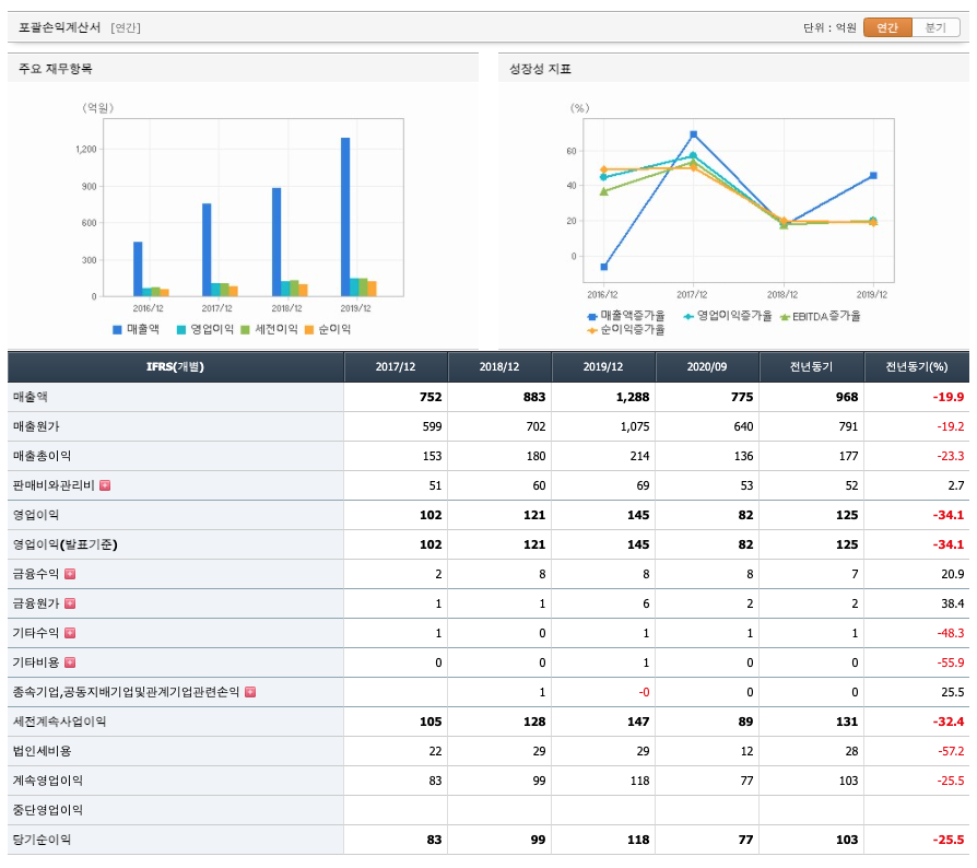 매출액 : 2017년 752억원, 2018년 883억원, 2019년 1288억원으로 증가하였으며, 2020년 3분기까지 775억원으로 전년동기 -19.9%으로 감소하였습니다.