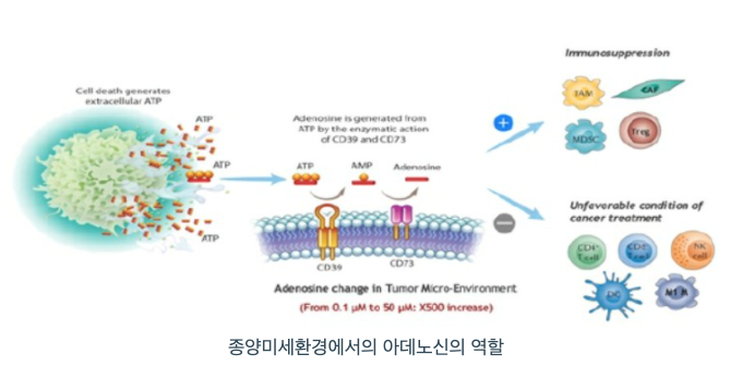 암세포는 정상세포 대비 5~50배 정도 높은 농도의 아데노신을 생산하여 A2A 수용체의 활성화를 유도함으로써 T 세포와 NK 세포의 신호를 막아 암세포의 사멸이 억제된다. A2A 수용체의 길항제는 이러한 암세포의 면역억제기전을 조절하여 항암효과를 나타내게 된다.