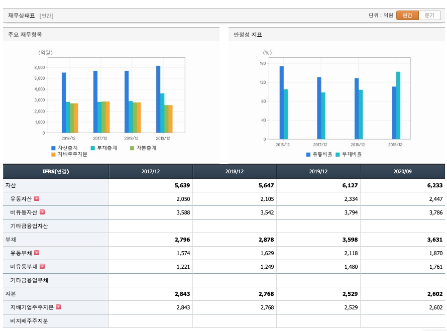 매출액 : 2017년 4607억원, 2018년 5039억원, 2019년 5175억원으로 증가하고 있습니다. 2020년 3분기에는 4231억원으로 전년동기 6.9% 상승하였습니다.