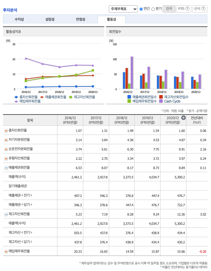 재고자산회전율 : 2018년 약 438억원, 2019년 약 434억원, 2020년 약 430억원이고, 회전율은 2018년 약 8회, 2019년 약 9회, 2020년 약 12회로 안정적입니다.