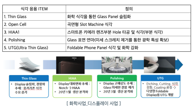 디스플레이 사업은 막대한 설비투자, 연구개발비, 생산 및 품질 관리에 대한 경험요구로 진입장벽이 높으며 국내 식각시장의 점유율 1위를 구축하고 있습니다. 식각 공정은 스마트폰, 태블릿 PC, Notebook, Curved Monitor 등 소형에서 중형 제품까지 다양하게 적용되고 있습니다. 당사는 LCD 뿐만아니라 Rigid OLED의 식각 공정을 모두 진행하고 있습니다. 식각공정을 활용한 식각제품은 다변화되고 있어 지속적인 성장을 기대하고 있습니다