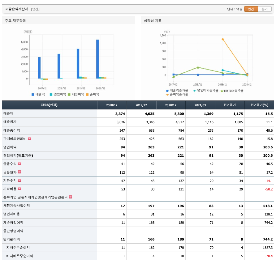 매출액 : 2018년 3374억원, 2019년 4035억원, 2020년 5300억원으로 증가하였고, 2021년 1분기 1369억원으로 전년동기대비 증가하였습니다. 2021년 1분기는 전년동기대비 16.5% 증가하였습니다. 2020년 분기별로 보면 2분기 1078억원, 3분기 1617억원, 4분기 1431억원입니다.