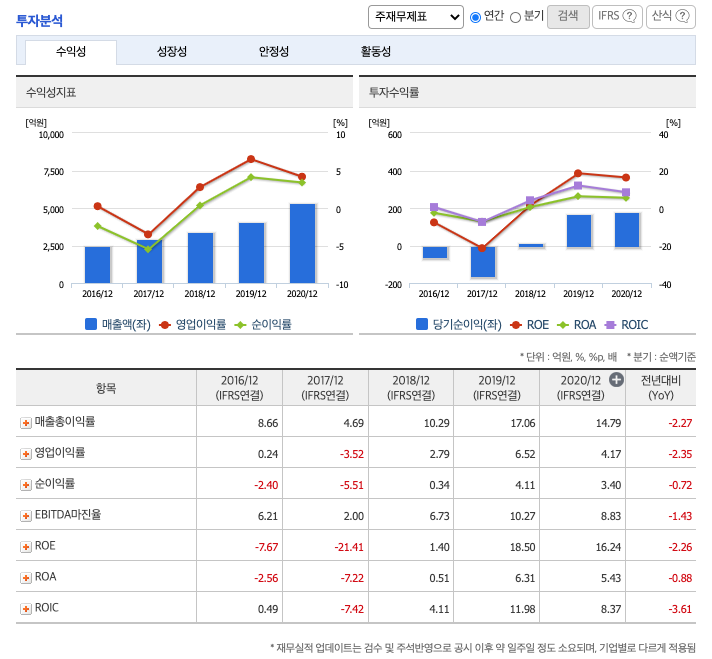 영업이익 : 2018년 94억원, 2019년 263억원으로 증가하였고, 2020년 221억원으로 감소하였고, 2020년 1분기 91억원으로 전년동기대비 증가하였습니다. 2021년 1분기는 전년동기대비 200.6% 증가하였습니다. 2020년 분기별로 보면 2분기 24억원, 3분기 102억원, 4분기 64억원입니다.