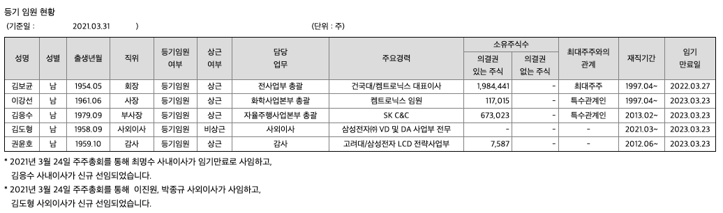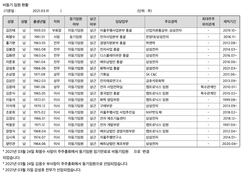 또한 자율주행 사업부문은 자율주행 및 커넥티드 카 환경에서 핵심기술인 V2X 통신 단말기 및 자율주행센서인 ADAS를 기반으로 하는 SVM을 개발 및 생산하고 있습니다. 화학사업 부문별로 보면 케미칼 사업부문에서는 페인트 및 도료에 들어가는 공업용 케미칼과 반도체 및 디스플레이에 들어가는 전자재료케미칼을 개발, 합성 및 정제하는 전자용 케미칼을 개발, 제조 및 판매하고 있습니다. 또한 디스플레이 사업부문에서는 모바일ㆍ모니터ㆍ노트북 PC용 등의 Rigid OLED Glass를 얅게 깍는 식각공정 및 스크레치 부분의 Glass를 연마하는 폴리싱 공정이 있습니다.