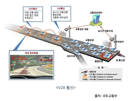 국토교통부와 과학기술정보통신부가 추진하는 차세대 지능형 교통 시스템(C-ITS: Cooperative-Intelligent Transport Systems) 사업에 통신은 현재 무선랜 기반기술인 DSRC(WAVE) 통신과 LTE/5G 등 이동통신 기반기술인 C-V2X 통신방식이 표준으로 경쟁하고 있습니다. 자율주행차가 도로를 달리기 위해 교통상황과 주변시설물, 차량간 정보공유 등 다방면의 정보가 필요한데 이러한 환경을 위해 필요한 것이 차세대 지능형 교통 시스템(C-ITS)입니다. 차세대 지능형 교통 시스템과 현재 교통 시스템의 가장 큰 차이점은 정보 공유입니다. 현재의 교통 시스템은 시설 및 교통상황, 차량이동 등의 정보를 수집해 가공하고 전달하는 흐름인 반면 차세대 교통 시스템은 차량과 차량, 차량과 도로, 컨트롤 타워가 실시간으로 데이터를 주고 받으며 능동적으로 대응합니다. 이는 곧 교통안전에서 효과적인 뿐만 아니라 불의의 상황에서도 즉각적인 대처가 가능합니다. 교통혼잡에서 오는 통행속도 원활, 비용 절감, 연료 저감 등에 효율적입니다.