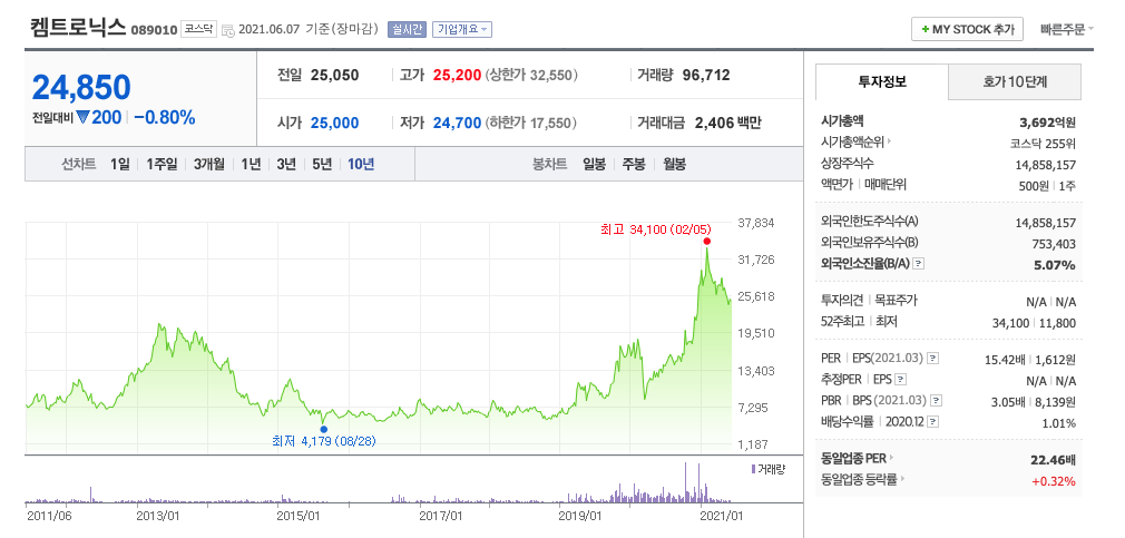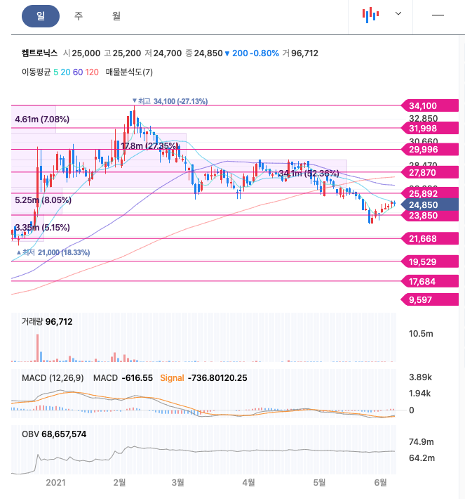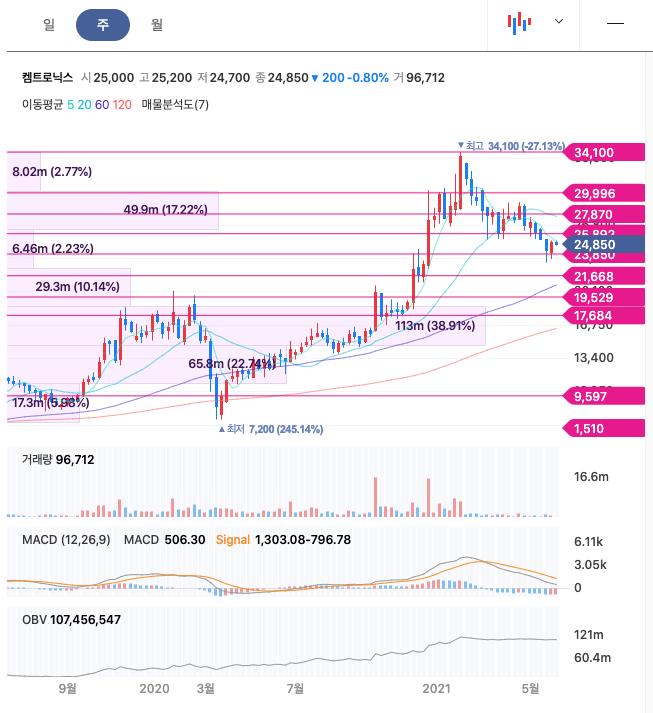 켐트로닉스는 20년 10월부터 주가가 급등하여 21년 1월에 최고 34,100원을 찍고 조정을 받고 있습니다.