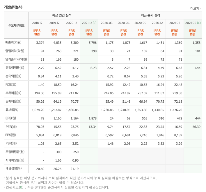 2021년 연결 기준 매출액 및 영업이익을 각각 5,796억원 (+9.3%, YoY), 390억원(+76.5%, YoY)으로 전망합니다. 2021 년은 ① 노트북, 태블릿 등 OLED 채택 증가에 따른 식각 수요 증가 ② 화학 원재료 가격 상승에 따른 케미칼 사업부 문 실적호조 ③ 정부주도 V2X 인프라 건설 본격화를 통해 외형성장과 수익성 개선이 동시에 이루어질 전망입니다.