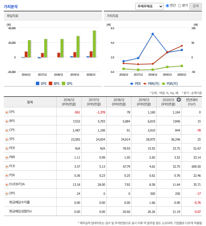 DPS(Dividend Per Share의 약자, 총배당금을 총주식발생수로 나눈 것, 한 주당 얼만큼의 배당금을 받을 수 있는지 알 수 있는 지표, DPS가 높을 수록 배당금이 많은 것임) : 2016년 24원, 2017년 0원, 2018년 0원, 2019년 300원, 2020년 250원으로 감소하였습니다.