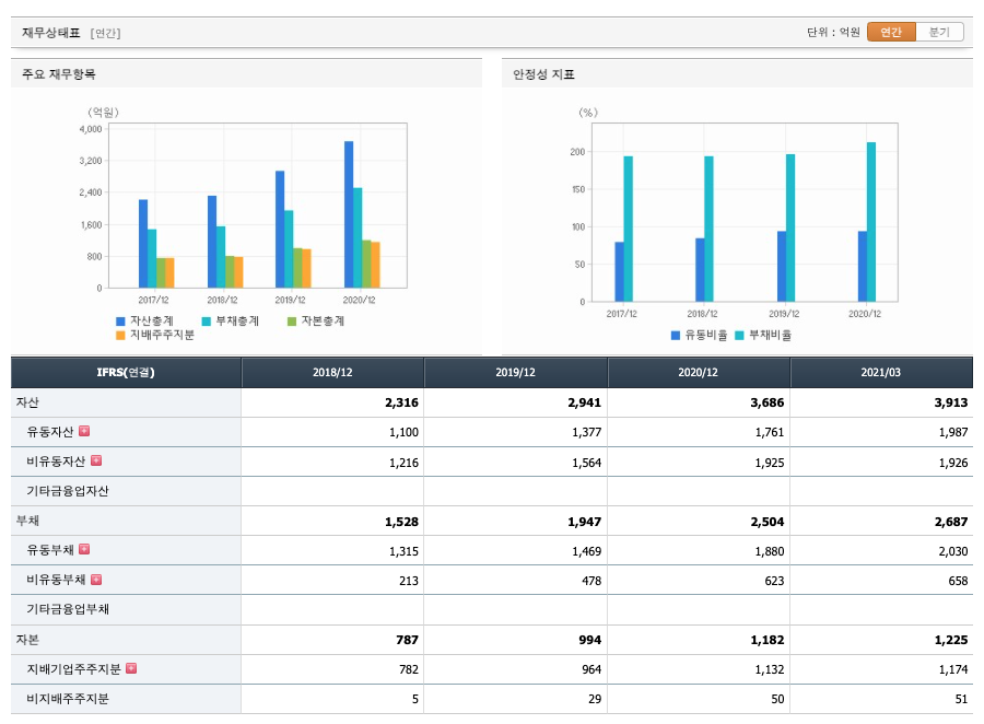 자산은 2018년 2316억원, 2019년 2941억원, 2020년 3686억원, 2021년 1분기 3913억원으로 증가 하였습니다.