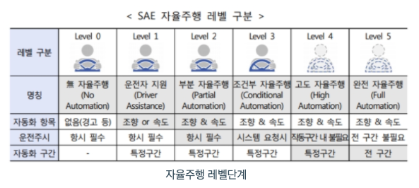 정부투자 방향으로는 2019년 10월 미래차 산업 발전전략으로 2027년 전국 주요도로 완전자율주행 레벨 4단계를 세계 최초 상용화 목표로 하여 2020년~2027년까지 레벨 4 기술확보를 위해 핵심부품, 시스템 및 인프라 기술 등에 집중 투자할 계획입니다. 2018년 3월 혁신성장동력 추진계획으로 2020년 고속도로 자율주행 레벨 3단계 상용화 및 2030년 완전자율주행 레벨 4단계 상용화를 목표로 하고 있습니다.