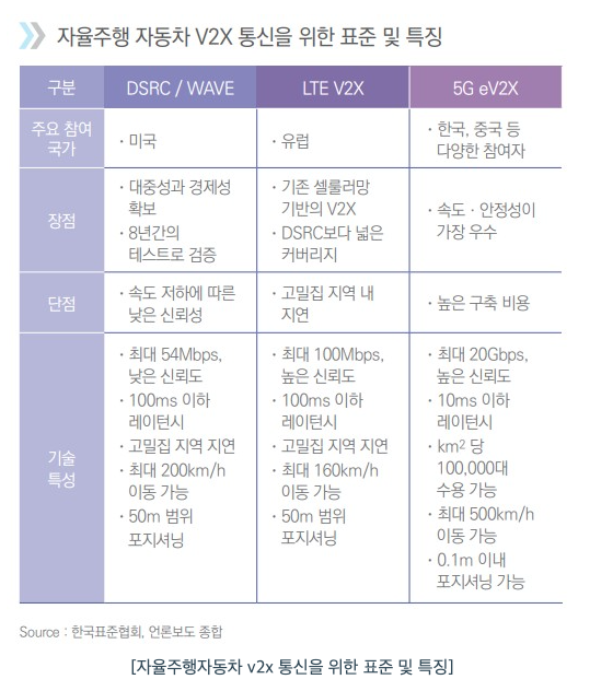 - DSRC 뿐만 아니라 C-V2X(Cellular 통신 기반의 최첨단 Connectivity) 통신