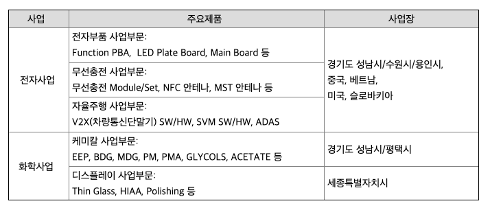 전자사업 부문별로 보면 TV를 비롯하여 모니터, 냉장고, 세탁기 등에 들어가는 모듈을 생산ㆍ판매하는 전자부품 사업부문과 스마트폰, 웨어러블 기기, 전장용 등에 들어가는 무선충전 모듈 및 세트 등을 생산ㆍ판매하는 무선충전사업부문이 있습니다.