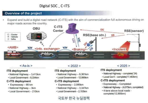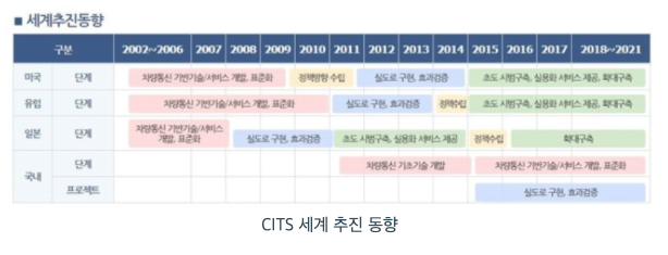 2012년부터 차세대 지능형 교통 시스템 도입을 위해 기본 계획이 수립되었고, 2014년 대전, 세종시에서 시범사업을 착수하기 시작했습니다. 초기 차세대 지능형 교통 시스템 도입 논의 때에는 교통안전에 중점을 두었으나 현재는 자율주행차와 연계한 경제 성장을 도모하고 있습니다.