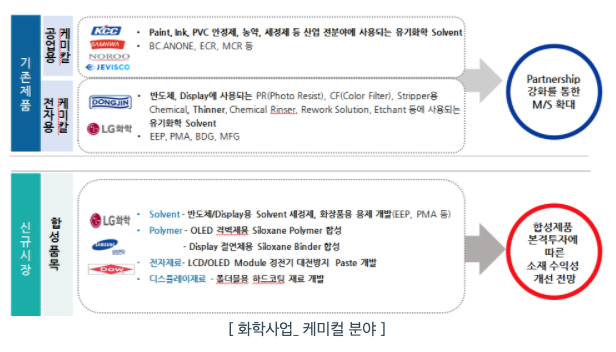 화학 케미칼 사업은 1983년 창립이래 오랜 업황 Know-how와 경쟁력있는 Sourcing Line을 통해 파트너들과의 신뢰관계를 기반으로 기존 사업을 강화하는 동시에 신규 사업 기회를 적극적으로 모색하고 있습니다. 화학 케미칼 사업의 전자재료연구소는 지속적인 R&D 투자를 통해 ATC(우수기술연구센터)로 선정되었으며 지속가능한 글로벌 기업으로 성장하고자 개발 및 제조 경쟁력을 강화하고 있습니다. 주요 파트너인 동진쎄미켐, LG화학, 동우화인켐, KCC 및 삼화페인트 등 글로벌기업에 케미컬 제품 및 상품을 안정적으로 공급하고 있으며 최근 신규 전자재료 시장의 치열한 경쟁 속에서 고객사와의 지속적 협력을 통해 전자재료케미칼의 시장점유율을확대하고 있습니다.