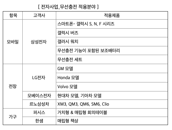 무선충전 시장은 모바일(스마트폰, 태블릿PC, 무선이어폰, 스마트워치 등) 분야에 두드러지게 적용되고 있으며 가전제품, 자동차로 적용 범위가 확대되고 있습니다. 당사는 스마트폰과 전장용 무선충전기에 제품을 주로 적용하고 있습니다. 스마트폰은 현재 갤럭시 시리즈 프리미엄폰 위주로 적용되고 있으나 향후 중저가폰으로 확대 적용 가능성도 있으며, 전장용 무선충전 적용 모델도 점차 확대되는 추세입니다. 애플에 이어 삼성전자도 2021년 출시된 프리미엄 스마트폰(갤럭시 S21)에 기본 구성품으로 제공하는 유선 충전어댑터를 별도 판매하기 시작했습니다. 또한 경박단소, 비용절감 등의 사유로 애플이 이어폰 단자를 삭제함에 이어 올해 하반기에 아이폰 유선충전 단자가 제거될 것으로 전망되고 있습니다. 애플이 이렇게 충전포트를 제거하기 시작하면 이런 형태가 업계 표준이 될 가능성이 높아 점차 무선충전 시장 수요도 증가할 것으로 기대됩니다. 적용분야가 광범위한 무선충전 사업은 R&D 역량을 강화하여 고부가 가치를 창출할 수 있는 무궁무진한 성장 가능성을 가진 사업입니다.