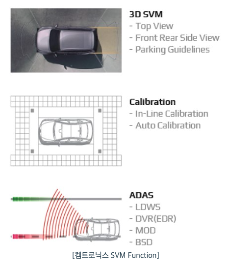 카메라의 위치가 차량마다 상이하기 때문에 자체 개발한 칼리브레이션(Calibration)을 통해서 화질과 영상간의 부드러운 연결성을 확보하고 자동노출 및 색조정이 가능합니다. 기존 시장에 SVM 제품은 존재하지만 대부분 VGA급으로 화질이 좋지 않고, 많은 양의 영상 데이터를 처리하기 위해서 DSP(Digital Signal Processor)가 적용된 AP(Application Processor)가 필요하며 고가로 시중에 공급되고 있습니다. 하지만 당사에서는 소프트웨어의 고도화와 최적화를 통해서 저가의 범용 ARM AP에서 구동이 가능하도록 가격경쟁력을 확보하고 있으며 고화질 HD급의 3D View 모드를 지원하는 SVM 개발 및 양산하고 있습니다. 또한 SVM Full HD 자체 카메라 기반의 ADAS 센서 개발 중에 있습니다. ADAS 기술에는 DVR(Digital Video Recorder), LDWS(Lane Departure Warning System), MOD(Moving Object Detection), BSD(Blind Spot Detection) 등이 있습니다.