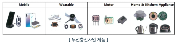 당사의 무선충전 사업은 스마트폰 및 전장에 들어가는 송신용 무선충전 모듈 및 세트를 개발 및 생산하고 있습니다. 2019년 4월, 당사의 종속회사 위츠에서 삼성전기의 무선충전 및 NFC 칩 코일 사업을 전략적으로 인수하여 스마트폰에 적용되는 NFC(Near Field Communication) 안테나, MST(Magnetic Secure Transmission) 안테나, 수신용 무선충전 모듈(WPC: Wireless Power Charger)로 적용제품을 확대하였습니다. 또한 NFC+MST+무선충전 모듈과 같이 제공되는 전자파 차폐기능을 지닌 차폐용 시트 소재를 자체 개발 및 조달하며 대규모 생산 Capa를 보유하고 있어 무선충전 모듈 및 세트의 대량 생산에 유리한 사업구조를 구축하였습니다 당사는 주로 자기유도 방식의 무선충전 모듈(소재와 코일) 및 세트를 개발하여 양산하고 있습니다.