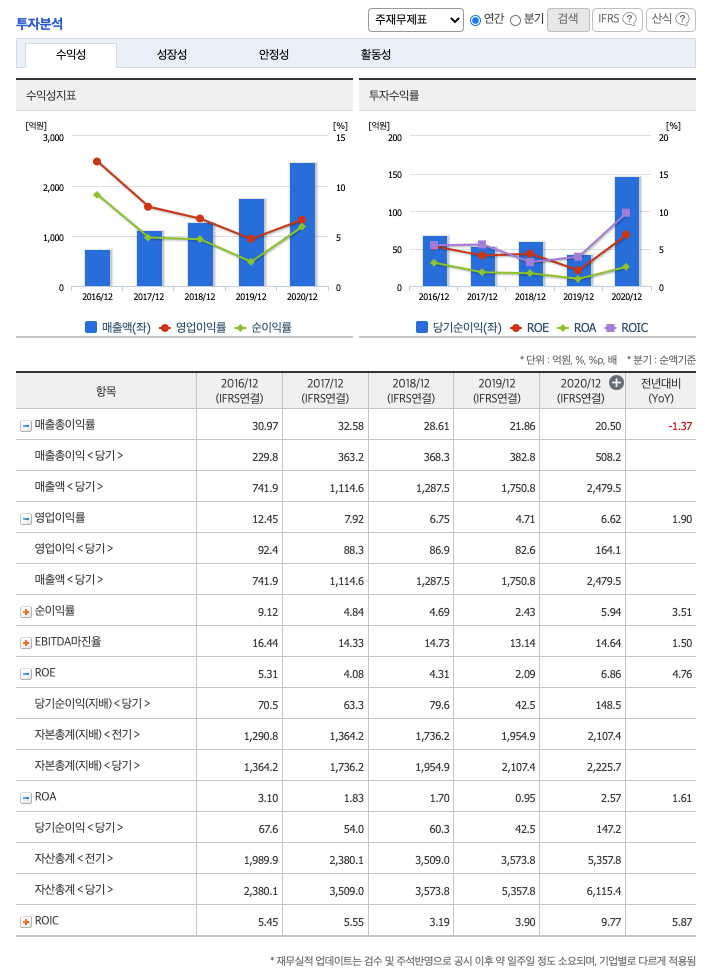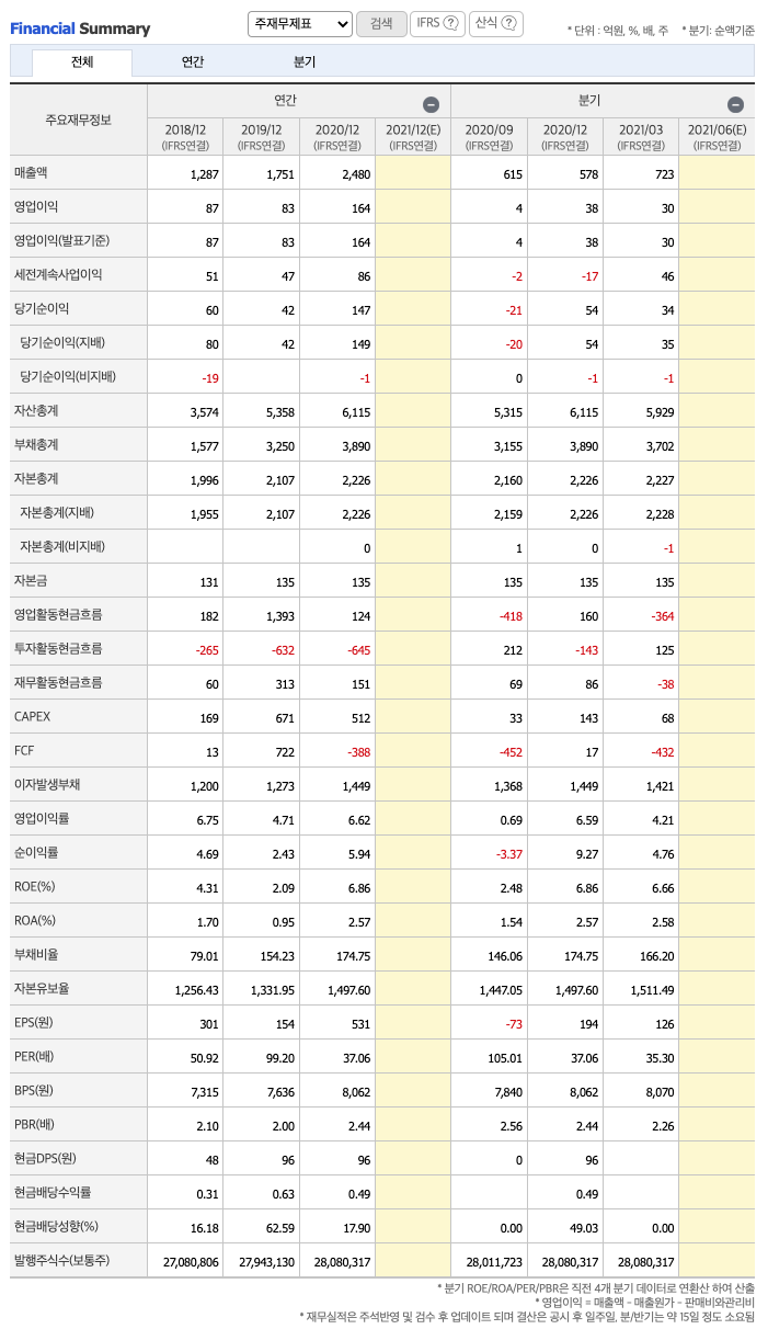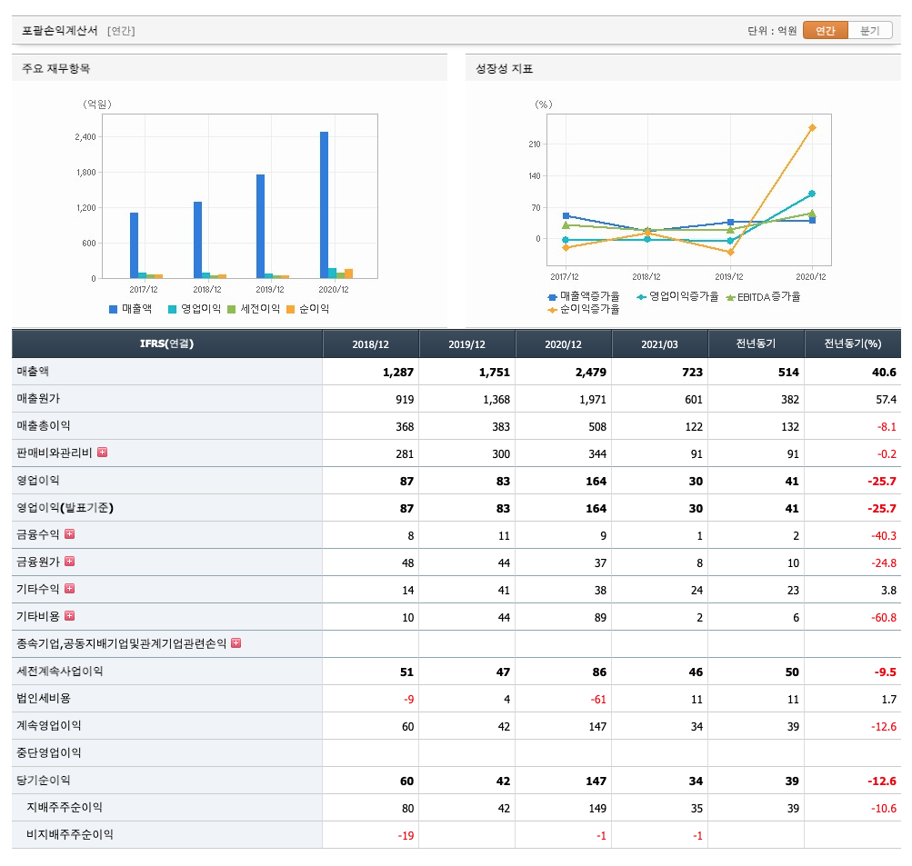 매출액 : 2018년 1287억원, 2019년 1751억원, 2020년 2479억원으로 증가, 2021년 1분기 723억원으로 전년동기대비 증가하였습니다. 2021년 1분기는 전년동기대비 40.6% 증가하였습니다. 2020년 분기별로 보면 2분기 773억원, 3분기 615억원, 4분기 578억원입니다.
