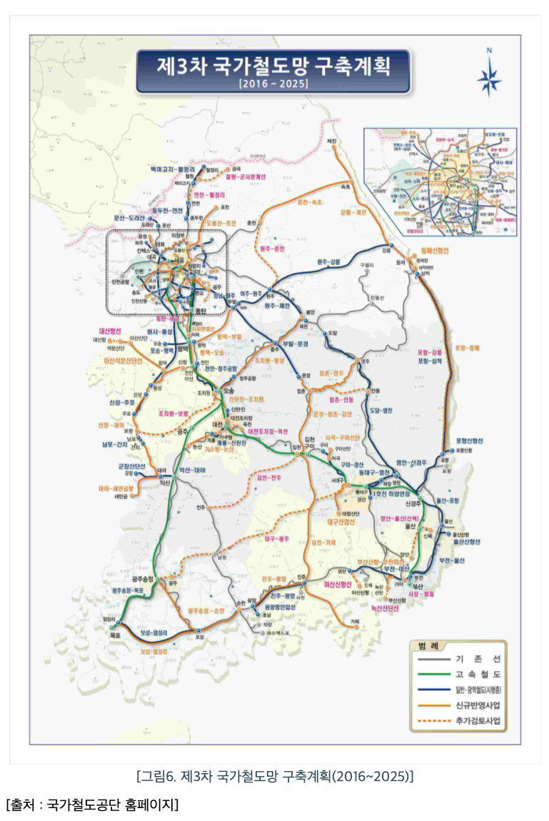 철도산업은 한때 하향산업으로 여겨지기도 했으나, 최근 기후 변화에 따른 환경문제가 지속적으로 제기됨에 따라 친환경 대체 교통수단으로써 다시 각광받고 있습니다. 하지만 국내 철도 산업의 현황은 OECD 17개국과 경제규모, 소득수준, 국토면적 등과 비교해 보았을 때 부족한 실정입니다. 현재 국내 철도의 전체 구간은 3,828km로서 적정 철도 구간인 6,000km에 비해 약 2,000km 부족하며, 광역철도는 인구규모, 면적으로 비교했을 때 일본 도쿄 대비 약 54% 부족합니다. 또한, 경부선, 중앙선 등의 수도권 구간의 선로용량이 철도수요 증가에 비해 용량한계에 근접하였고. 도시철도는 복잡한 수도권의 통근시간을 OECD 평균수준(38분) 이하로 개선 등 승개들의 이용 환경 향상이 필요합니다. 이에 정부는 철도산업 발전의 체계적, 국가적 관리의 필요성을 인식하고 철도투자를 효율적, 체계적으로 수행하기 위해 철도건설법 제 4조 규정에 의한 10년 단위 법정계획을 세워 2006년 제1차 계획을 시작하였습니다. 2011년 제2차 계획에 이어 정부는 2016년 2월에 1. 철도운영 효율성 제고 2. 주요 거점 간 고속이동서비스 제공3. 대도시권 교통난 해소 4. 안전하고 이용하기 편리한 시설 조성 5. 철도물류 경쟁력 경화 6. 통일시대 대비 한반도 통합철도망 구축의 6대 중점계획을 세우고 사업타당성 종합평가를 거쳐 기 시행사업 49개, 신규사업 32개 등의 추진사업을 선정한 제3차 국가철도망구축계획을 발표했습니다.
