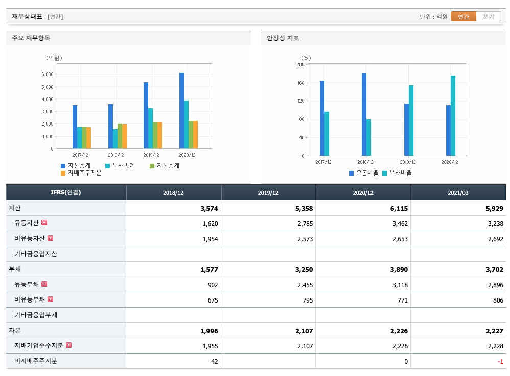 부채는 2018년 1577억원, 2019년 3250억원, 2020년 3890억원으로 증가, 2021년 1분기 3702억원으로 감소 하였습니다.