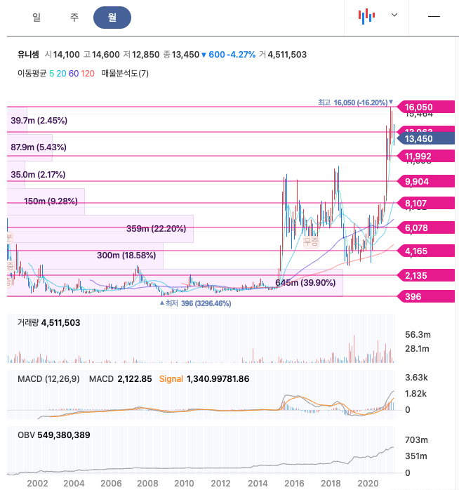 유니셈은 21년 1월 주가가 급등하였고, 이후 21년 4월 최고 16,050원을 찍고 조정을 받았습니다.