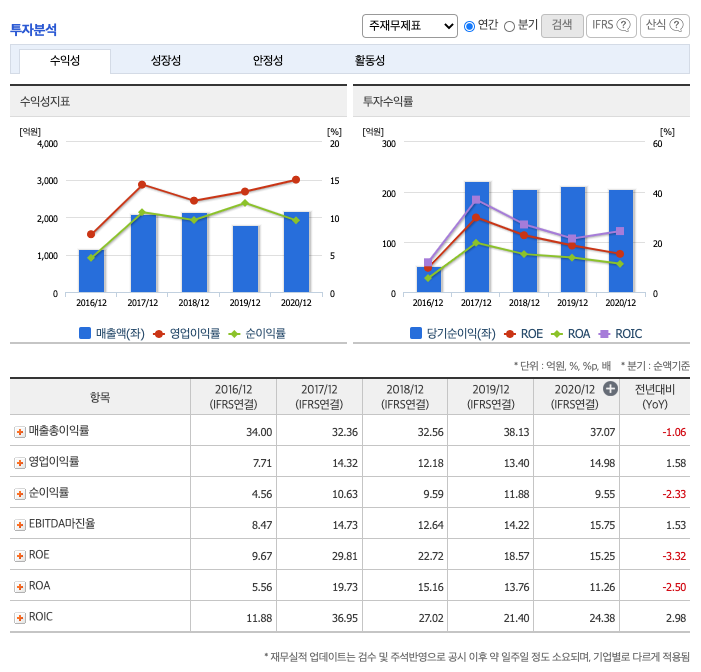 영업이익률 : 2016년 약 7.71%, 2017년 약 14.32%로 증가, 2018년 약 12.18%로 감소, 2019년 약 13.4%로 증가, 2020년 약 14.98%으로 증가하였습니다.