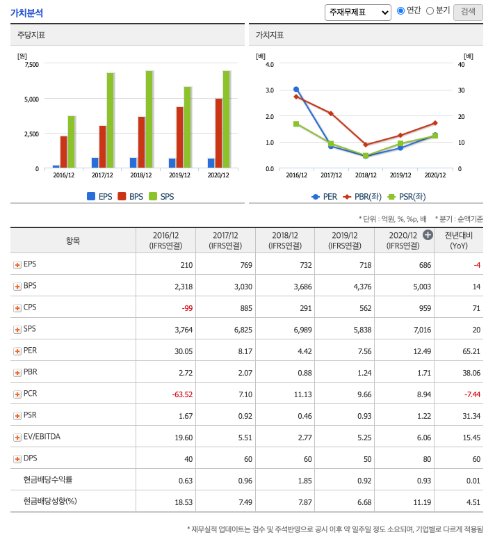DPS(Dividend Per Share의 약자, 총배당금을 총주식발생수로 나눈 것, 한 주당 얼만큼의 배당금을 받을 수 있는지 알 수 있는 지표, DPS가 높을 수록 배당금이 많은 것임) : 2016년 40원, 2017년 60원으로 증가, 2018년 60원, 2019년 50원으로 감소, 2020년 80원으로 증가하였습니다.