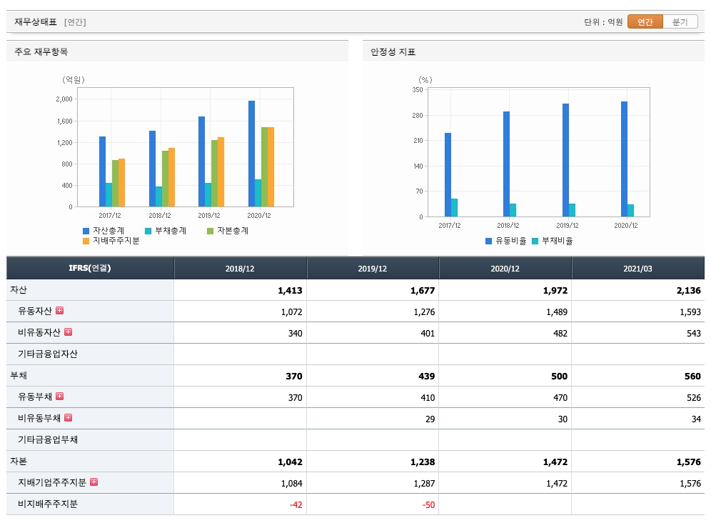 자산은 2018년 1413억원, 2019년 1677억원, 2020년 1972억원, 2021년 1분기 2136억원으로 증가하였습니다.