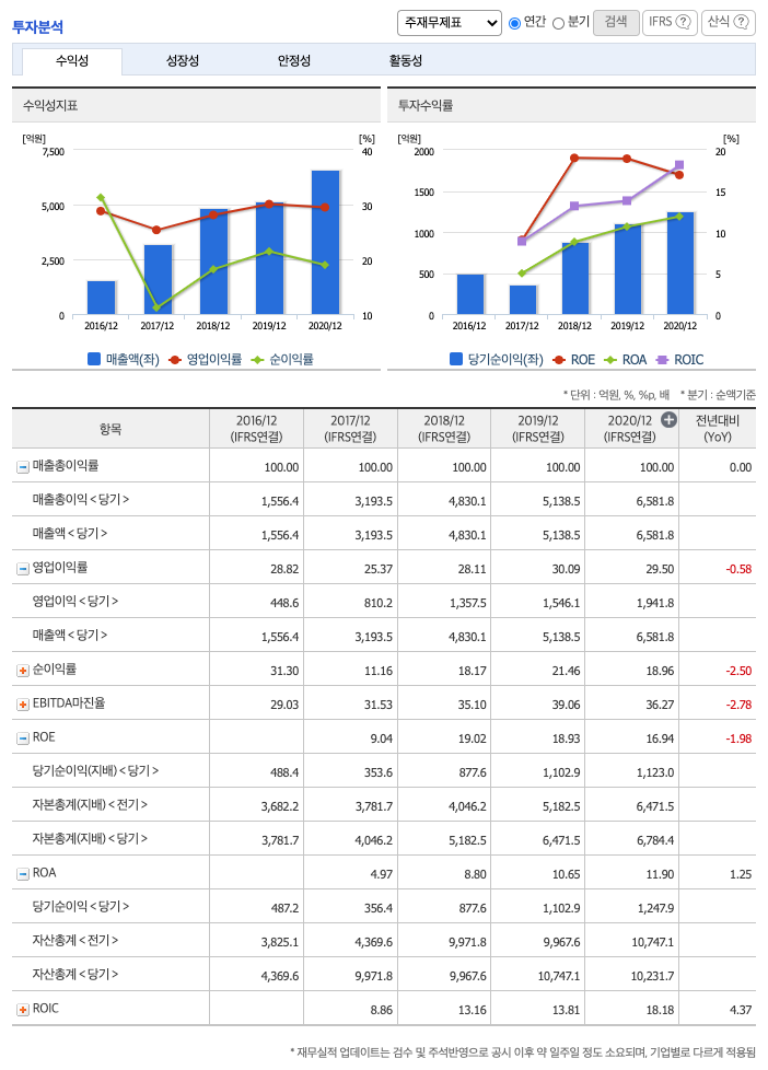 ROE(Return On Equity, 자기자본순이익율, 주주의 관점) : 2017년 약 9%, 2018년 약 19%, 2019년 약 18%, 2020년 약 16%이고, 자기자본순이익율은 이상율(10%)보다 높습니다.