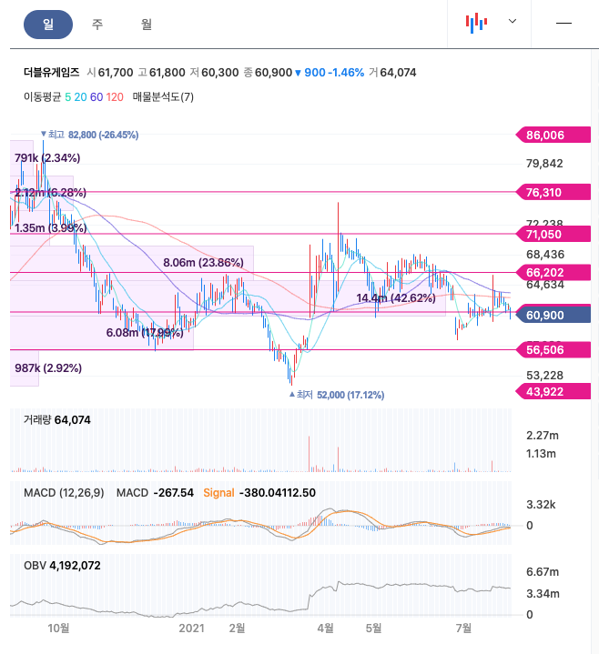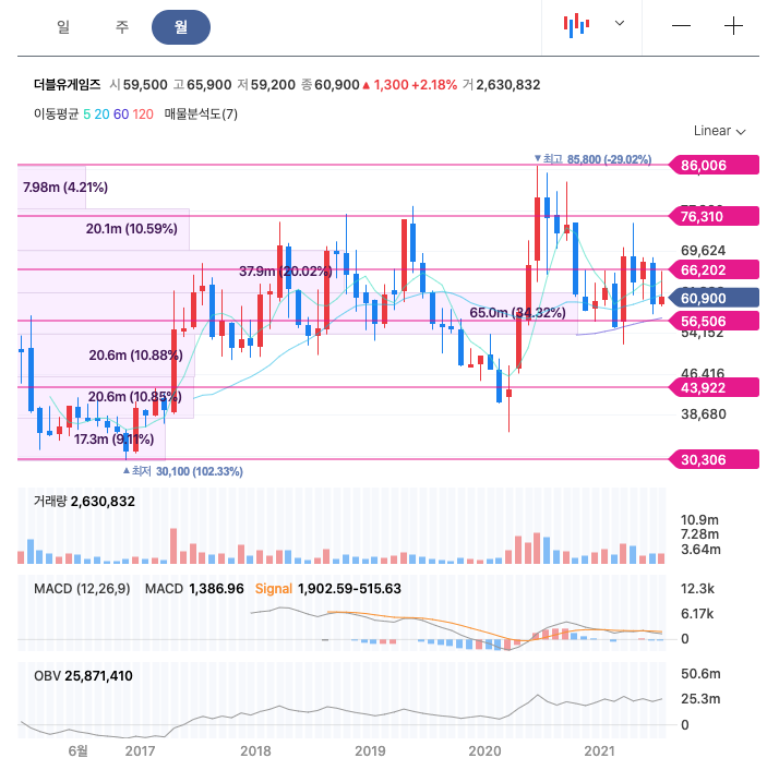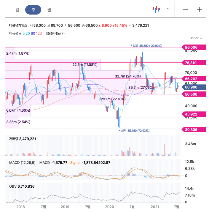 더블유게임즈는 20년 6월 최고 85,800원을 찍고 조정을 받은 뒤 보합중에 있습니다.
