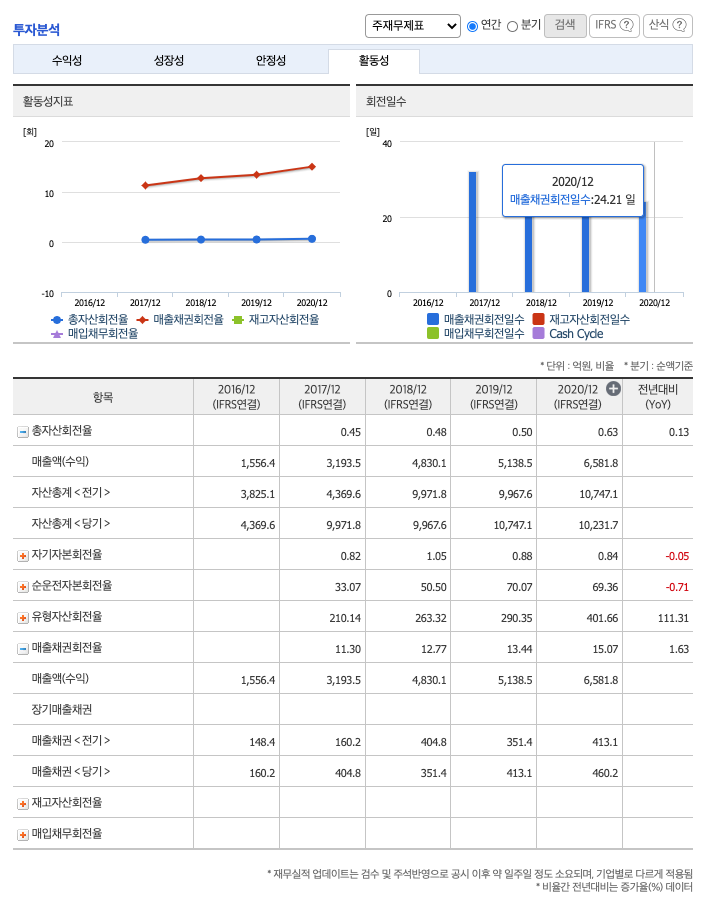 매출채권회전율(높을 수록 좋습니다) : 2018년 약 351억원, 2019년 약 413억원, 2020년 약 460억원이고, 회전율은 2018년 약 12%, 2019년 약 13%, 2020년 약 15%로 안정적입니다.