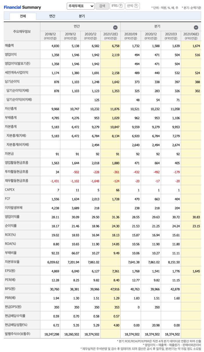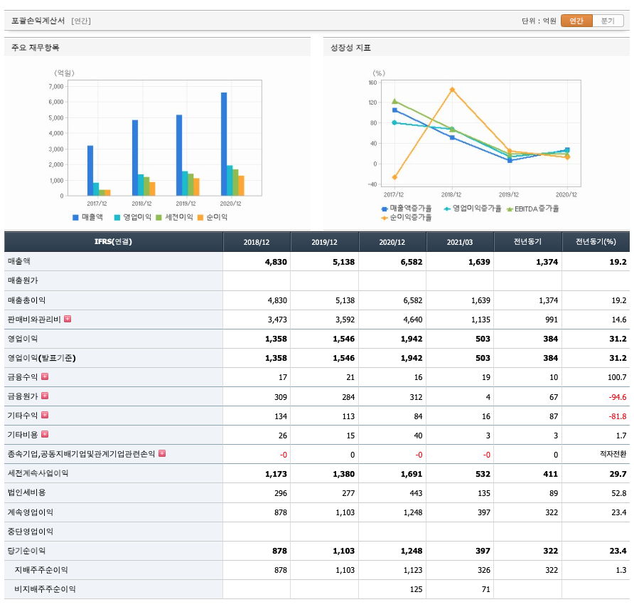 매출액 : 2018년 4830억원, 2019년 5138억원, 2020년 6582억원으로 증가, 2021년 1분기 1639억원으로 전년동기대비 증가하였습니다. 2021년 1분기는 전년동기대비 19.2% 증가하였습니다. 2020년 분기별로 보면 2분기 1888억원, 3분기 1732억원, 4분기 1588억원입니다.
