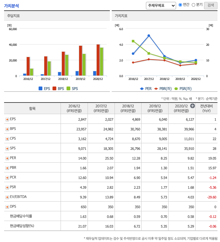 DPS(Dividend Per Share의 약자, 총배당금을 총주식발생수로 나눈 것, 한 주당 얼만큼의 배당금을 받을 수 있는지 알 수 있는 지표, DPS가 높을 수록 배당금이 많은 것임) : 2016년 650원, 2017년 350원, 2018년 350원, 2019년 350원, 2020년 350원으로 전년동기 동결입니다.