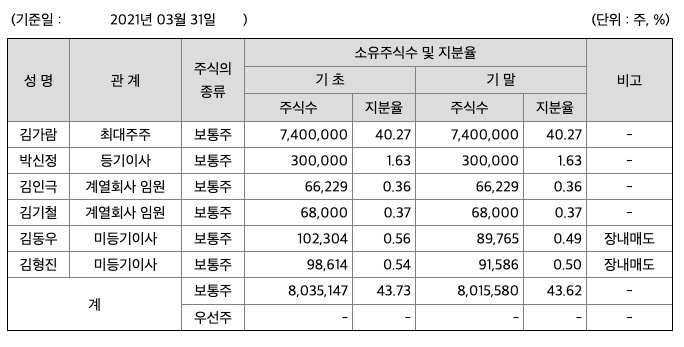 2021년 3월말 기준 당사의 최대주주는 김가람(대표이사)이며, 그 지분은 7,400,000주(지분율 40.27%), 특수관계인을 포함한 지분은 8,015,580주(지분율 43.62%)입니다.