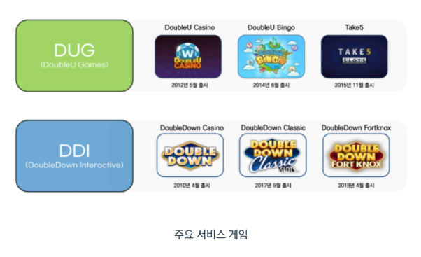 더블유게임즈는 주요 제품으로 DoubleU Casino, DoubleU Bingo, Take5 등 4가지 게임을 서비스 하고 있으며, DoubleDown Interactive LLC는 주요 제품으로 DoubleDown Casino, DoubleDown Classic, DoubleDown FortKnox 등 3가지 게임을 서비스하고 있습니다.