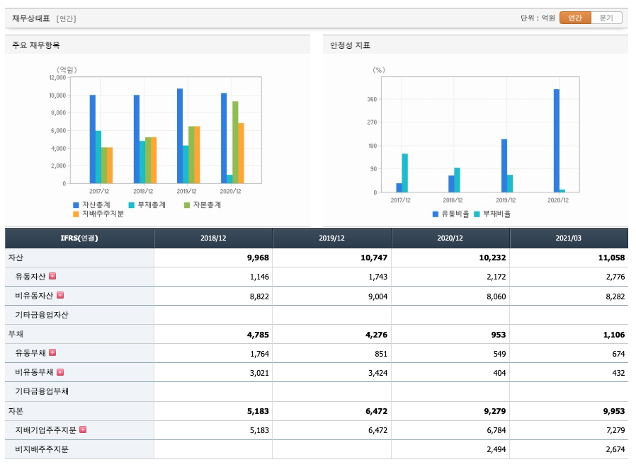 자산은 2018년 9968억원, 2019년 10,747억원으로 증가, 2020년 10,232억원으로 감소, 2021년 1분기 11,058억원으로 증가하였습니다.