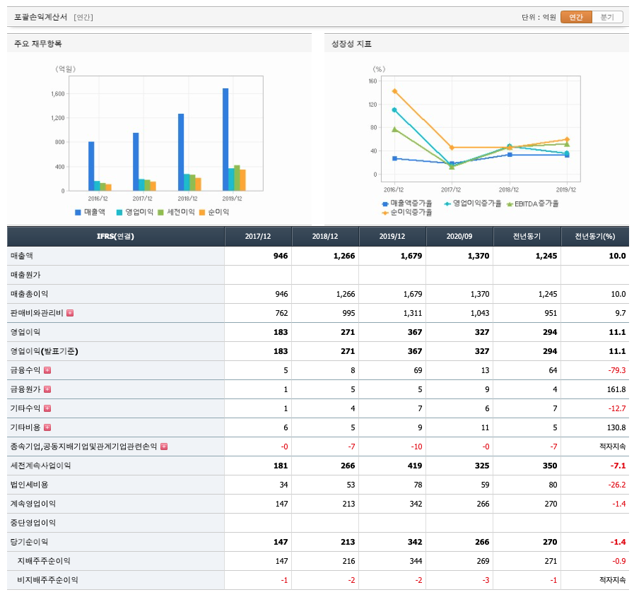 매출액 : 2017년 946억원, 2018년 1266억원, 2019년 1679억원으로 꾸준히 우상향하였습니다. 2020년 3분기까지는 1370억원으로 전년동기 10%상승하였습니다. 2020년 분기별로 보면, 1분기는 415억원, 2분기는 453억원, 3분기는 502억원으로 증가하였습니다.