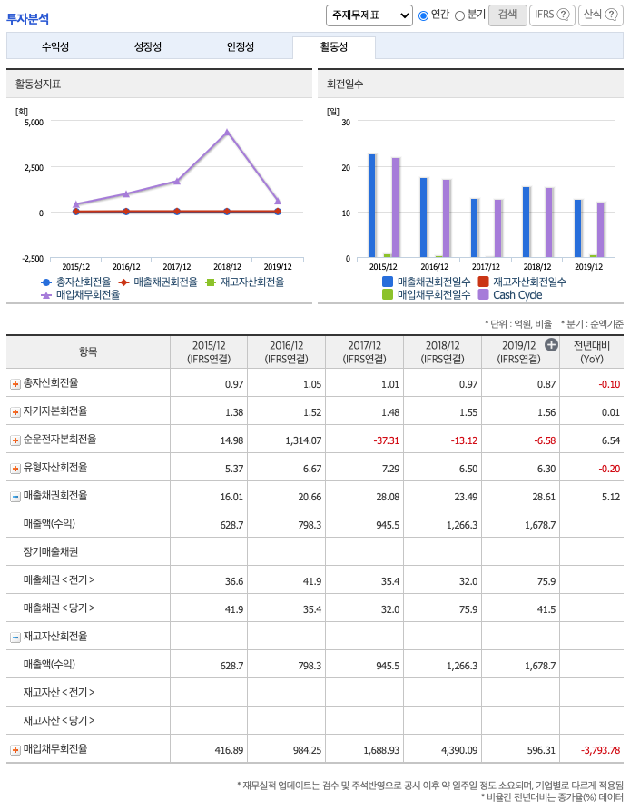 매출채권회전율 : 2017년 32억원, 2018년 75억원, 2019년 41억원 증감을 오가고 있습니다. 회전율은 2017년 28회, 2018년 23회, 2019년 28회로 보합상태이며 현재는 안정적입니다.