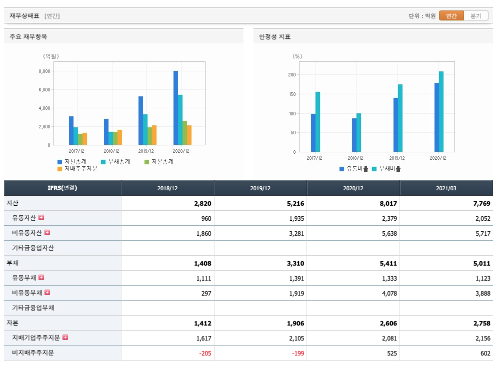 자산은 2018년 2820억원, 2019년 5216억원, 2020년 8017억원으로 증가, 2021년 1분기 7769억원으로 감소하였습니다.