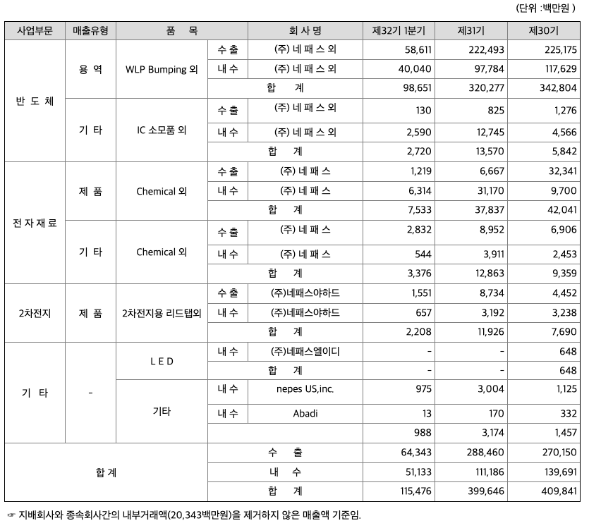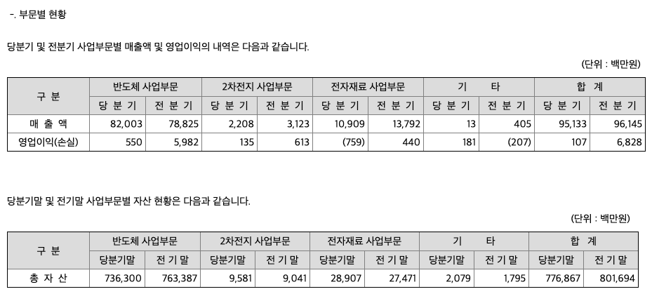 주요 종속회사를 포함한 각 사업부문별 매출은 반도체 사업부문, 전자재료 사업부문, 2차전지 사업부문으로 이루어져 있으며 반도체 사업부문은 WLP 및FOWLP/FOPLP, Test 등으로 구성되어 있고, 전자재료 사업부문은 반도체, LCD 등의 제조공정용 케미칼인 현상액(Developer), Color Filter용 현상액(Color Developer), 세정제(Cleaner), 연마제(Slurry) 등의 제품으로 구성되어 있으며, 2차전지 사업부문은 2차전지용 리드탭등 이 있습니다. 당분기중 전체 매출액에서 각 사업부문이 차지하는 비율은 다음과 같습니다.