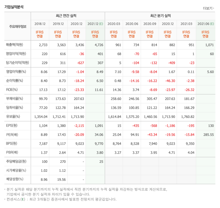 영업이익 : 2018년 220억원, 2019년 616억원으로 증가, 2020년 -36억원으로 감소, 2020년 1분기 1억원으로 전년동기대비 감소하였습니다. 2021년 1분기는 전년동기대비 -98.4% 감소하였습니다. 2020년 분기별로 보면 2분기 -70억원, 3분기 -65억원, 4분기 32억원입니다.