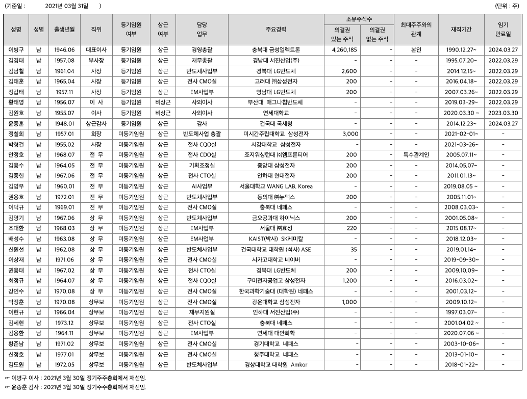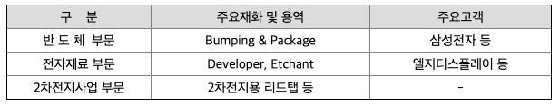 회사의 엔드팹(End-FAB) 기술을 근간으로 첨단 시스템 반도체의 소형화, 고성능화에 기여하는 패키징 및 테스트의 반도체 사업과 반도체/디스플레이 제조에 사용되는 전자재료사업으로 구분되어 있습니다. 즉, 반도체사업은 당사가 사업화에 성공한 플립칩Bumping 기술을 확보하여 스마트폰, 웨어러블 디바이스, 자동차 등 다양한 스마트 어프리케이션등의 Chip-set을 위한 WLP(Wafer Level Package), FOWLP/PLP로 국내외에서 확고한 입지를 구축하고 있으며, 전자재료 사업은 고순도재료생산 기술을 바탕으로 반도체, LCD등 미세회로 Pattern을 구성하기 위하여 사용되는 공정재료인 현상액(Developer), Color Filter 현상액(Color Developer), Etchant, PR(Photo regist), 세정제(Cleaner), 연마제(Slurry)등의 소재사업에 집중하고 있습니다. (반도체 분야) 반도체 산업은 점차 시스템반도체의 중요성이 부각되고 있으며 국내 대표 반도체 업체들 역시 시스템반도체 시장의 중요성을 인식하여 해당 영역의 투자에 박차를 가하고 있는 상황으로, 시스템반도체 시장은 메모리 대비 그 규모면에서도 3배 이상 거대한 시장입니다. 현재 IT Application 시장을 주도하는 제품은 Mobile에 기반을 둔 Smart Device들이며 이를 구성하는 주요 부품들이 대부분 시스템 반도체입니다. 본사의 첨단 End-FAB 비즈니스는 시스템반도체 Supply Chain의 핵심 공정이며 국내 공급업체는 전무한 상황에서 세계수준의 기술로 산업을 선도하고 있습니다. (전자재료 부문) 전자재료는 케미컬 시장의 특수성에 기인하여 변동성이 낮으며, 신제품인 기능성 Chemical이 매출에 기여하기 시작하였습니다. 특히 전자재료 사업부문은 높은 국내 시장 점유율과 그간 집약한 기술 노하우를 바탕으로 수입에 의존하던 Chemical을 국산화하였으며 내재화를 통한 신뢰성 검증으로 주요 고객 대상 신규 매출을 기대하고 있습니다. (2차전지 부문) 2차전지용 부품을 국산화하여ESS, EV용 배터리에 적용, 급성장하는 에너지 분야로 영역을 확대하고 있습니다.