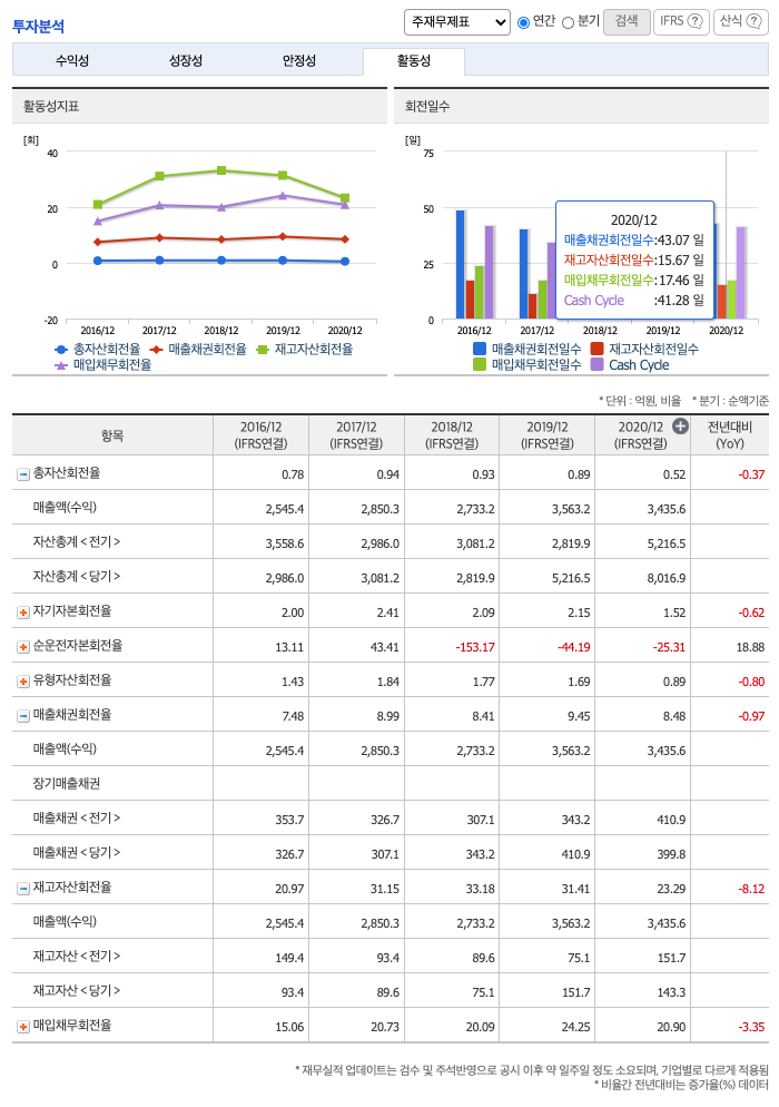 재고자산회전율 : 2018년 약 75억원, 2019년 약 15억원, 2020년 약 143억원이고, 회전율은 2018년 약 33%, 2019년 약 31%, 2020년 약 23%로 안정적입니다.