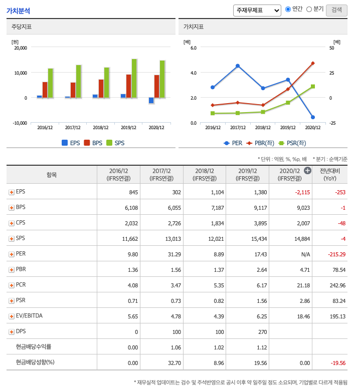 ROE(Return On Equity, 자기자본순이익율, 주주의 관점) : 2016년 약 15.21%, 2017년 약 5.05%으로 감소, 2018년 약 17.13%으로 증가, 2019년 약 17.12%으로 감소, 2020년 약 -23.33%으로 마이너스 전환하였고, 자기자본순이익율은 이상율(10%)보다 낮습니다.