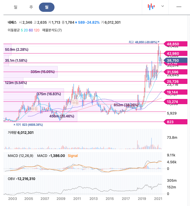 네패스는 20년 12월 급등하여 21년 1월 최고 48,850원을 찍고 조정을 받은 뒤, 횡보중에 있습니다.