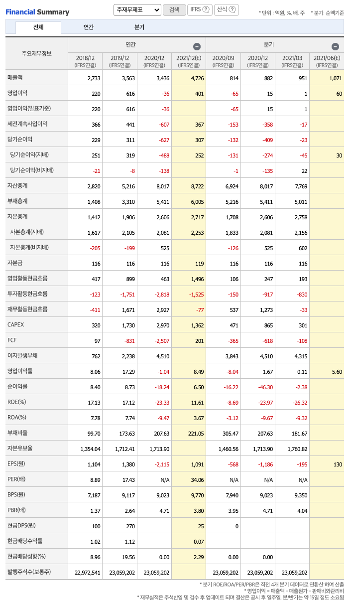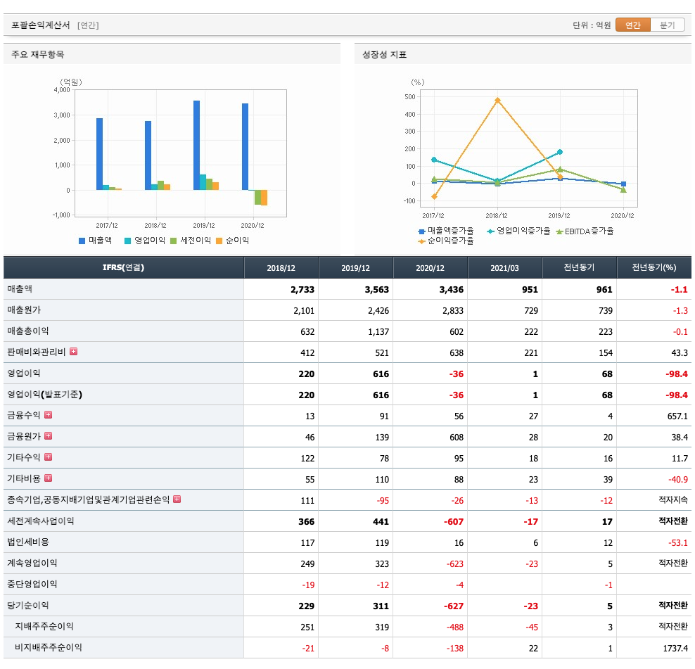 매출액 : 2018년 2733억원, 2019년 3563억원으로 증가, 2020년 3436억원으로 감소, 2021년 1분기 951억원으로 전년동기대비 감소하였습니다. 2021년 1분기는 전년동기대비 -1.1% 감소하였습니다. 2020년 분기별로 보면 2분기 734억원, 3분기 814억원, 4분기 926억원입니다.