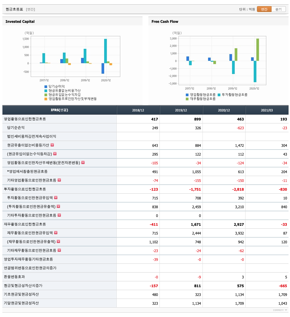 투자활동 현금흐름 : 2018년 -123억원, 2019년 -1751억원, 2020년 -2818억원, 2021년 1분기 -830억원으로 투자활동 현금흐름이 원활합니다.