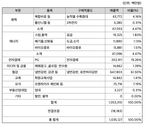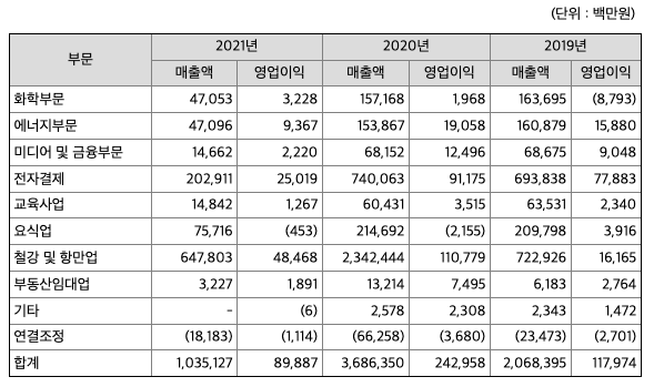 회사는 사업의 성격에 따라 9개 부문(화학, 에너지, 전자결제, 미디어 및 금융, 교육사업, 요식업, 철강 및 항만업, 부동산임대업, 기타)으로 구분하였으며 사업부문별 현황을 요약하면 아래와 같습니다